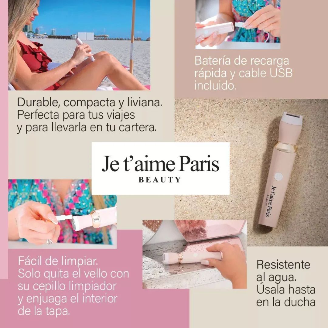 La depiladora Je T’aime Paris Beauty elimina el vello del cuerpo y rostro sin dolor ni irritación. Incluye 4 accesorios intercambiables, tecnología Wet & Dry y diseño hipoalergénico ideal para piel sensible.