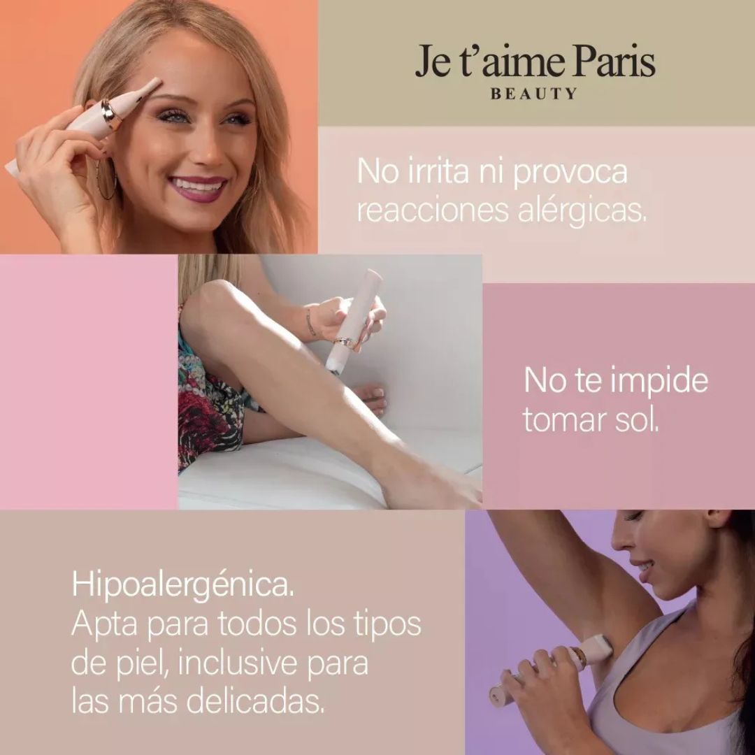 Je T’aime Paris Beauty es la depiladora portátil que te permite eliminar el vello del cuerpo y rostro sin dolor, sin irritación y sin riesgo de cortes. Su tecnología hipoalergénica y los 4 accesorios intercambiables te permiten depilar cada zona del cuerpo con precisión y suavidad.