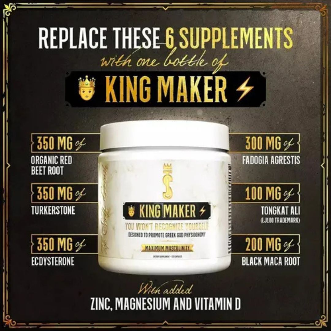 King Maker es un suplemento nutricional diseñado para hombres activos que buscan optimizar su salud física, hormonal y muscular. Su fórmula 13 en 1 combina ingredientes adaptógenos y naturales reconocidos por apoyar el rendimiento masculino y el bienestar integral.