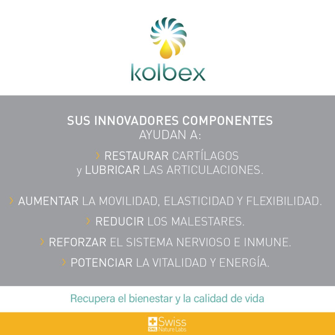 Kolbex es el suplemento articular formulado con proteína de caracol Nutraspersa, Zinc, Vitamina B6 y fortificación extra de Vitamina C. Su acción regenerativa combate molestias articulares desde el interior, repara tejidos y mejora la movilidad de forma natural.